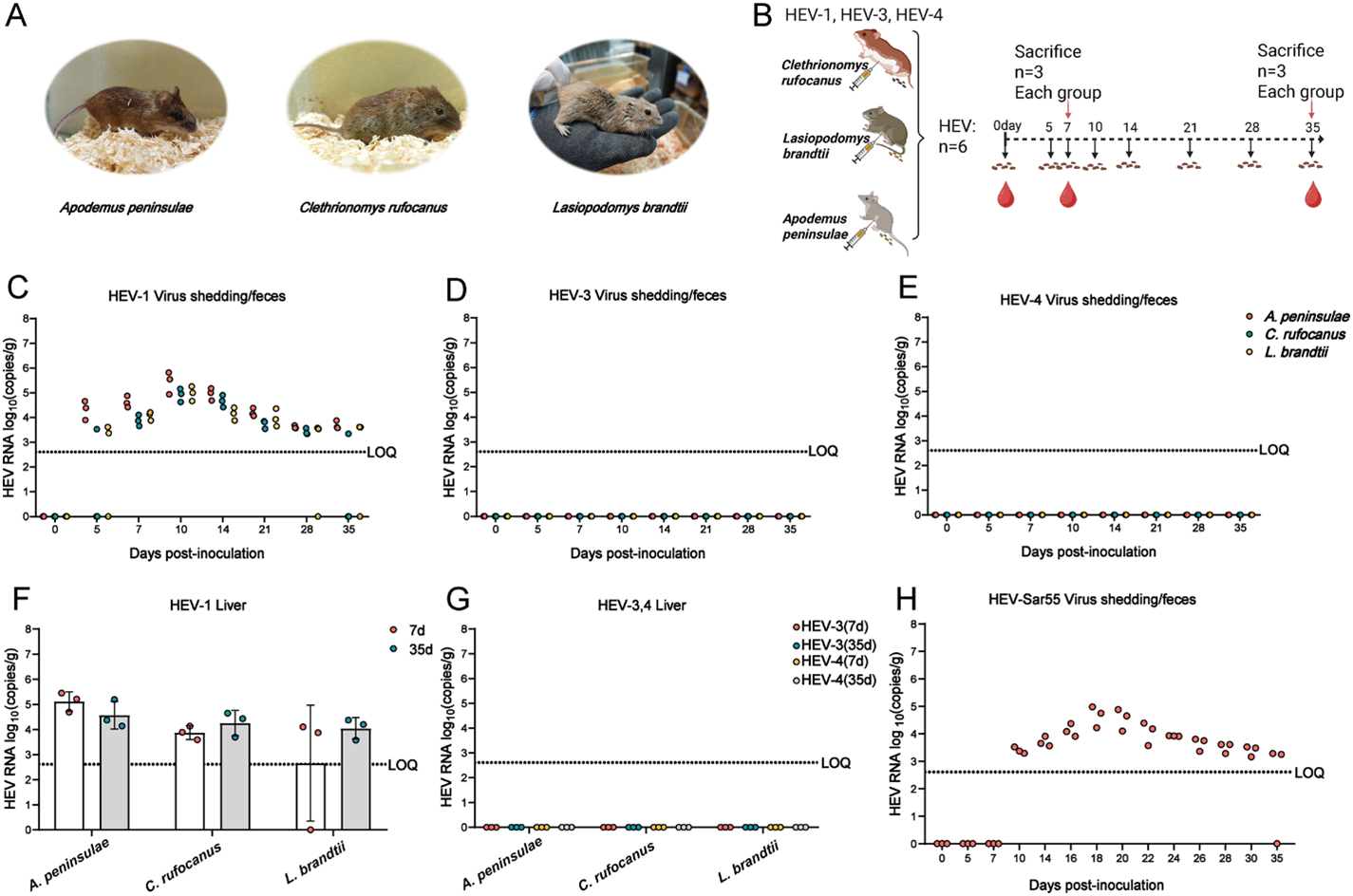 Recently, Dr. Lin Wang, Dr. Xin Yin and Dr. Changyou Xia, from China, domesticated three wild rodent species-Apodemus peninsulae (A. peninsulae), Clethrionomys rufocanus (C. rufocanus), and Lasiopodomys brandtii (L. brandtii), from the wild populations to laboratory breeding. They then investigated their susceptibility to HEV-1 infection. Following HEV-1 inoculation, all three species exhibited detectable fecal HEV RNA shedding and HEV RNA in multiple tissues, including the liver, spleen, kidney, and intestine. Among them, A. peninsulae was more susceptible to HEV-1 when compared to the other two rodent species. To further confirm A. peninsulae’s susceptibility, they used another HEV-1 strain, Sar55 (subtype 1a), and found that A. peninsulae was also susceptible to this strain. In contrast, inoculation with HEV-3 and HEV-4 resulted in no detectable HEV RNA in feces or tissues, indicating genotype-specific susceptibility in these wild rodents.